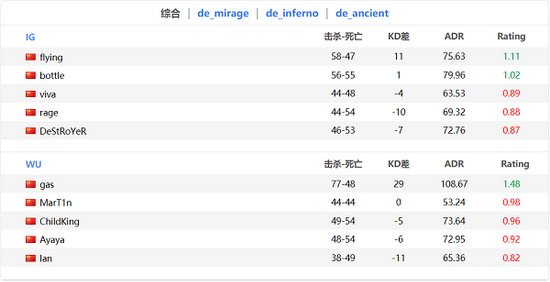 图一来到WU的选图Mirage,先作为进攻方的WU一上来就给了IG一个下马威,WU凶狠的进攻让IG招架不住,上半场WU便拿到了11分的巨大领先优势。来到下半场后WU没有给IG太多机会,仅让IG拿到了1分便将比赛结束。来到图二后,WU延续了上一张图的凶狠进攻,一次次的撕开IG的防线,半场战罢WU以9-6的比分暂时领先,上半场暂时落后的IG,在下半场状态开始回暖,flying几次关键击杀帮助队伍赢下回合胜利,IG吹起了反击的号角,相反WU却越打越懵,没有了节奏,最终IG赢下图二,成功追回一分。来到决胜图Ancient,上半场WU出色的防守让IG久攻不下,半场战罢WU手握五分的领先优势进入到下半场,下半场开始,WU却突然哑火,作为进攻方WU 进攻的方式比较单一而且套路不多,相反则IG展现出了更加娴熟的经验和对地图更加深厚的理解,让WU在下半场仅仅拿到一分便将比赛胜利收入囊中。IG成功让一追二逆转WU,挺进总决赛。