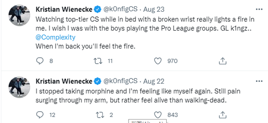 k0nfig表示,在床上躺着看cs点燃了心中的火焰;此外,他决定停用吗啡,因为感受到疼痛能让自己不那么像行尸走肉