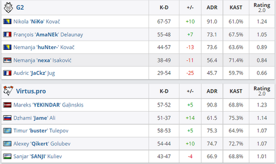 首先来带VP的选图Dust2,尼公子手枪局三杀以及第二回合的五杀ACE为队伍首开局面,来到长枪后,YEKINDAR用实际行动告诉大家何为狂,他疯狗式的突破一次次撕开G2的防线,半场战罢VP以9-6的比分进入到下半场。下半场开始,VP赢下手枪局,这时,尼公子再一次站了出来,图一尼公子便砍下1.64的恐怖rating,他的出色表现带领G2打出了一波10-0的进攻高潮直接终结比赛,G2先下一城。