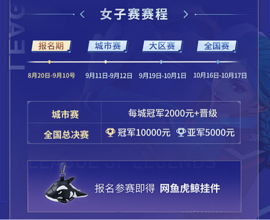 目前,网鱼竞技场英雄联盟女子赛招募上海、深圳等9个城市热爱英雄联盟召唤师峡谷5V5的女玩家,报名无段位要求,参赛即可获得网鱼虎鲸挂件奖励。城市赛和全国总决赛的冠军均可获得2000元现金奖励和10000元现金奖励。