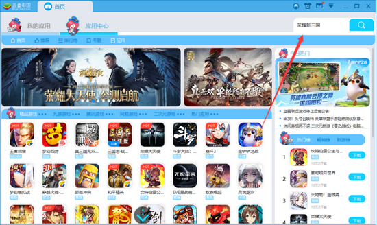 方法2:进入“应用中心”首页,通过推荐游戏,也可找到《荣耀新三国》。