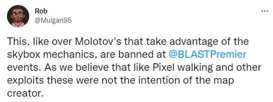“利用空气墙机制的燃烧弹在BLAST系列赛事是不允许使用的,我们相信像‘像素点位(由于建模问题可以让玩家站在一个像素点上,实际效果很夸张)’或者其他地图漏洞一样,并不是地图创作者最开始的意图。”