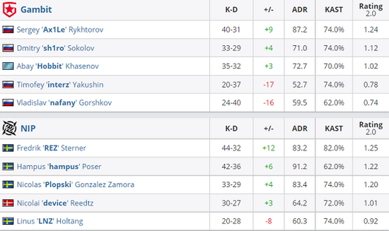 图二Gambit没有选择自己的红星大厦,而是选择了Inferno,这也给了NIP机会,hampus则延续了上一场的出色状态,带领着NIP在上半场以10-5的比分领先进入到下半场。下半场,红星被今天的NIP彻底打乱了自己的节奏,最终NIP仅让红星拿到一分便将比赛终结。