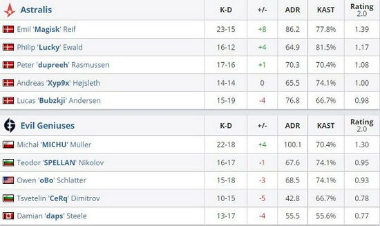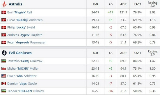 Astralis 2-0 Evil Geniuses(Dust2 16-11;Nuke 16-10)