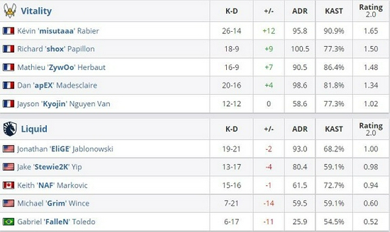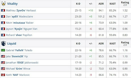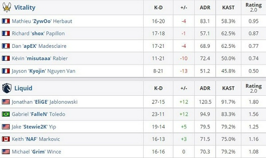 在misutaaa无可挑剔的发挥之下法国战车成功在CT方以7-0领先,Liquid被对手完全压制,他们仅在上半场末尾抢下宝贵的几分,攻防互换后赢下手枪局的vitality正式宣告对手的死亡,最终以16-6迅速结束图一。