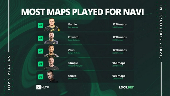 根据HLTV统计的数据,为NaVi效力的所有选手中flamie以1296张地图排名榜首,在NaVi的6年里,他为NaVi打了34266个回合。随着他与NaVi合同解除,这个数据暂时定格在这。