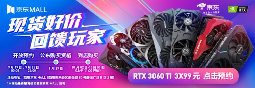 京东携手各大显卡厂商回馈玩家,9月19日 0点 - 9月25日24点开放GeForce RTX 3060 Ti的抢购预约,由后台随机抽取666位用户获得购买资格,到手价3*99元,然后线下完成付款,中签的朋友还可以参与线下活动能抽取免单机会!