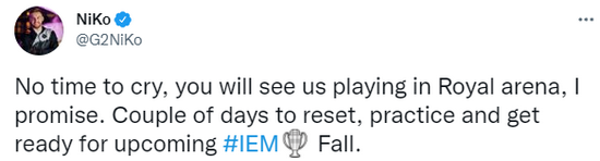 “现在不是流泪的时候,我保证你们会在皇家竞技场看到我。现在好好休息几天,然后重新开始练习并且为IEM秋季赛做好准备!”