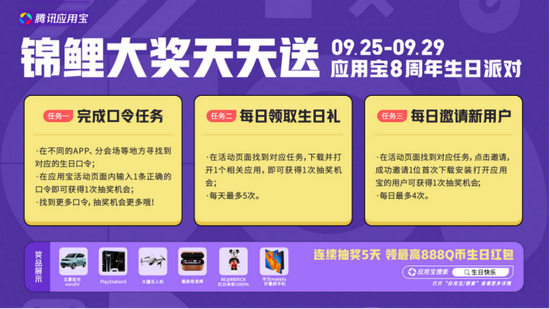 9月25日至9月29日,腾讯应用宝正式开启“8周年生日派对”活动。活动期间,用户打开应用宝搜索“生日快乐”关键词进入活动页面,按步骤完成对应任务,即可参与抽奖,获得惊喜奖品,中奖率100%。