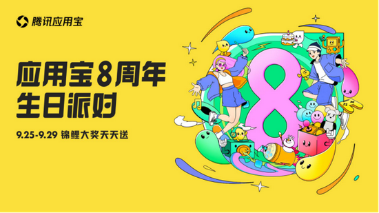 9月25日至9月29日,腾讯应用宝正式开启“8周年生日派对”。用户可以在腾讯应用宝App进入活动页面,通过获取口令、下载指定App、邀请新用户三种方式获得抽奖机会,赢取丰厚奖品。