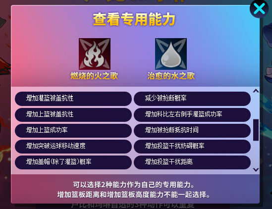 角色可以从30种辅助能力中选2种作为专用能力(篮板距离增加和篮板高度增加不能同时选择,2个角色是各自独立选择)