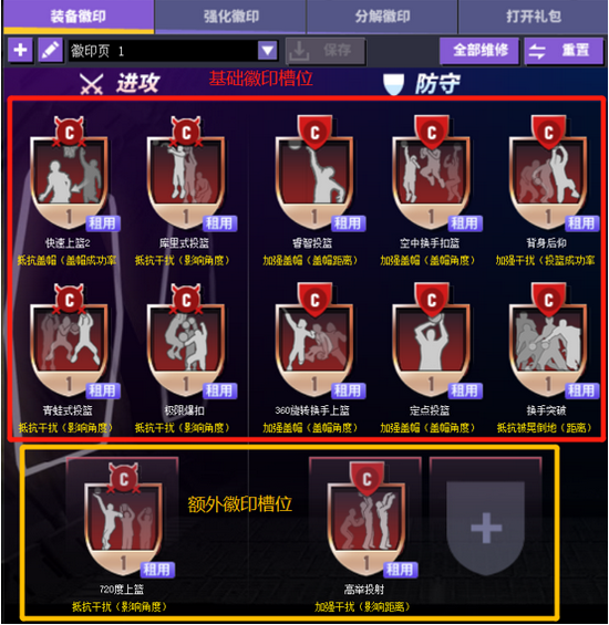 PF在TT阵容里是攻防一手抓,脏活累活都要抗的一个职业,进攻要牵制,要得分,防守要补G,要冒PF,还要卡C,真的是哪里都要看到他的身影。而我们知道,在TT的进攻中,PF的主要得分方式是扣篮。那我们就可以在徽印的进攻页里选择一些增强扣篮抗性的徽印属性。在技能方面可以选择常用的几个扣篮花式技能。