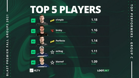 BLAST Premier 秋季赛C组的战事结束,HLTV公布了C组的Rating排名。