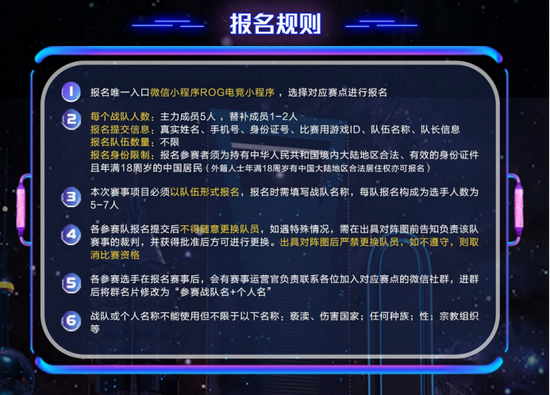 值得一提的是,目前2021星途电竞联赛报名系统已经正式开启,只要玩家年满18周岁,且拥有一支5~7人的队伍,便可以通过报名唯一入口——微信小程序ROG电竞小程序,以队伍的形式选择对应的赛点进行报名。