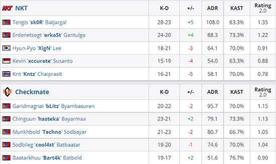 图二Nuke中,NKT在进攻端打出了7-0的梦幻开局,Checkmate在调整防守后成功限制了NKT,上半场结束双方比分6-9。下半场逐渐起色的Checkmate是越打越顺,Checkmate趁势而上在最后阶段完成反超,而后cool4st连续狙掉3人帮助队伍拿到赛点,最终比分16-14,Checkmate成功翻盘。