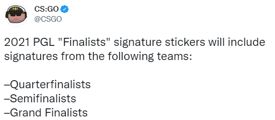 之前,就有爆料称本届Major的选手签名贴纸可能不是所有进入Major的选手都有的,现在看来确实如此,CSGO的官推也发推解释:2021 PGL Major的选手贴纸包括:四分之一决赛选手贴纸、半决赛选手贴纸和决赛选手贴纸。