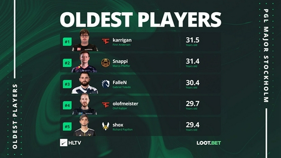 本次Major有哪些老将仍旧活跃在最顶端赛场?HLTV了给出数据统计——FaZe的karrigan是所有参赛选手中最为年长的。