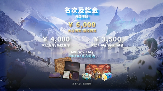 为感谢对于电竞赛事充满热情的Dotaer亲自参与其中,本次IWO大众及高校海选的前16名均可获得奖励:冠军奖金6000元、亚军4000元、季军及殿军3500元,第5到16名可获得DOTA2专属周边大礼包。另外如果当选赛事MVP,还可额外获得DOTA2专属麻将一副。