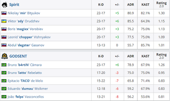 绿龙在赢下手枪局后连拿三分,Godsent在起到长枪后也是拿到了自己的首分,随后chopper联手magixx在B包点打出了一波完美的回防,接连丢分的Godsent被迫进入eco,绿龙借此机会继续扩大自己的领先优势,Godsent则依靠个人能力的发挥拿下几分,半场结束双方比分10-5。