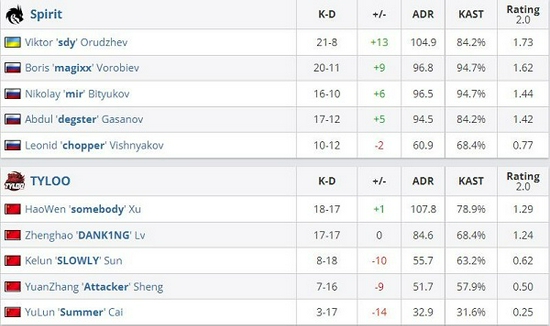 攻防互换后TYLOO重防A区,Spirit在收集到足够信息后直接转攻B区占领包点,赢下手枪局后Spirit没有给到TYLOO任何机会,最终以16-3的比分结束比赛。