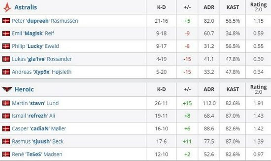 下半场手枪局stavn三杀拍门赢下回合,Heroic顺势拿到赛点,但来到长枪局的对决后Dupreeh与Magisk绽放出无限光芒,接连取得多杀拯救A队,但最终他们还是被巨大的比分压力所击倒,cadiaN以一波强势四杀亲手将比赛结束,比分16-7。