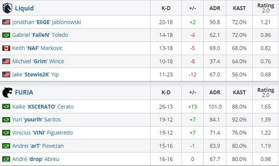 攻防互换后arT与KSCERATO合砍ACE,FURIA瞬间起势进一步将比分差距不断拉大,Liquid在下半场仅依靠EliGE与Grim的个人能力发挥拿到三分,就被FURIA的猛烈攻势所淹没,最终比分16-9。