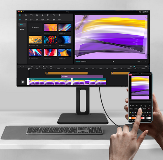 Type-C接口还能实现手机投屏一线直连,支持多种手机操作系统和桌面应用,可以直接连接键鼠控制手机,剪视频如同操作电脑一样,大幅提高办公效率;