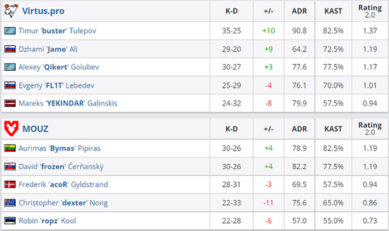 下半场手枪局mouz拿下后顺势连拿三分,状态回暖的mouz逐渐将比分追平,acoR的大狙也苏醒过来屡屡击溃VP的进攻,而VP下半场首分则是依靠tec-9翻盘拿下,随着Bymas强拆成功,双方比分来到11-14,随后frozen赢下1V1残局mouz率先拿到赛点,但顽强的VP连续攻占A区成功,VP将比分追至14-15,常规时间最后一回合,Qikert双杀将A区占领,VP成功将比赛拖入加时。加时赛mouz首开局面连拿两分,次局VP再次占领A区拿回一分,攻防互换后Jame三杀VP将比分追平,次局acoR赢下残局mouz再次反超比分,加时赛最后一分VP虽然枪械劣势但Jame开局便打掉一人,VP抓住机会成功将比赛拖入到第二个加时。第二个加时赛在Jame的发挥下VP连拿三分,最终VP抗住压力以22-18赢下决胜图。