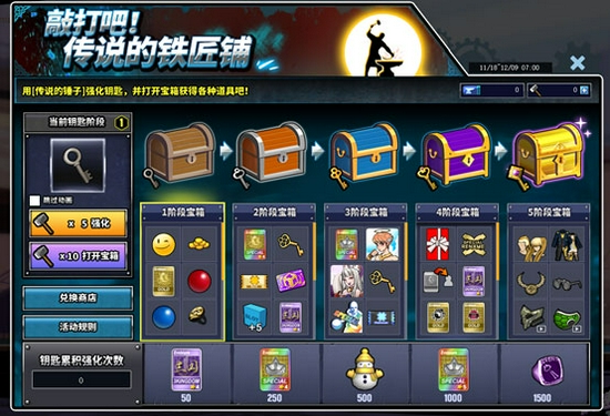 玩家可以用传说的锤子[强化]钥匙并且可以打开对应阶段的宝箱。[强化]钥匙和打开宝箱所需的传说的锤子数量根据当前钥匙阶段来决定。钥匙分为1~5阶段,5阶段是最高阶段!强化钥匙时分为成功和失败。