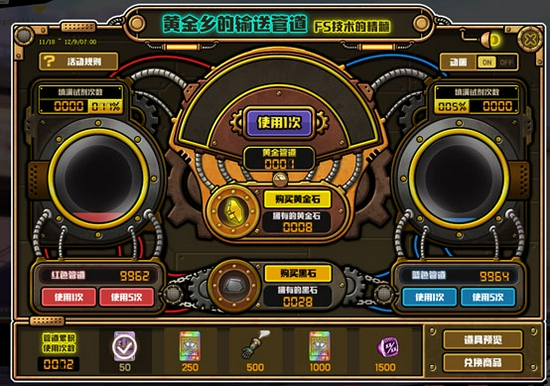管道里输入的试剂达到100%时“填满试剂次数”增加1次。红色管道和蓝色管道填满试剂次数都是1次以上时,填满试剂次数各减少1次并获得一个“黄金管道”。在拥有“黄金管道”的情况下,使用黄金石可以激活黄金管道,并获得更高级的道具。每次使用管道累计“管道使用一次”,经过下方5个节点可以获得不同礼物。使用红色管道和蓝色管道时有概率获得黄金兑换券,黄金兑换券可以用于兑换商品。
