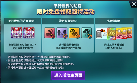 活动期间可以免费创建一个4种能力被限制的超特角色。由于角色刚来到平行世界,还非常虚弱~需要通过“能力恢复训练”来恢复自身实力。一起来完成能力恢复训练任务后解除能力限制获得“完全体”的角色吧。每周通过完成任务来恢复能力。同时也不要错过与此活动一起进行的其他活动哦!