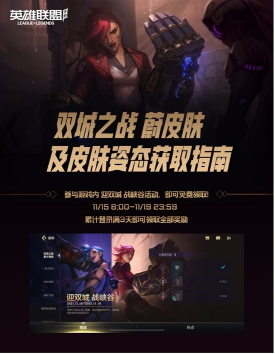 即日起到11.19,召唤师们只要累计登录满3天,即可领取永久双城之战蔚皮肤、皮肤姿态、永久击败印记甜蜜暴击!