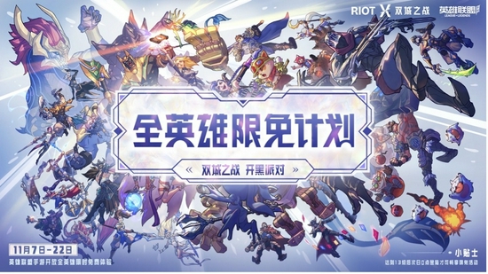 全英雄限免开放至11月22日结束,祝各位召唤师游戏愉快!(小贴士:为了保护新手环境体验,13级以下的召唤师暂不参加全英雄限免,您可以先通过10个新手限免英雄,及升级免费赠送的11个永久英雄来熟悉游戏,使用加成卡还能提高升级速度,尽享游戏乐趣!)