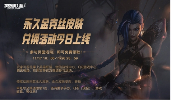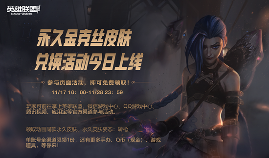 英雄联盟手游动画同款金克丝皮肤免费送啦!即日起至28日,召唤师们在图中三个渠道活动任选其一,每日参与,就能免费领取金克丝动画同款皮肤及姿态!(注意单游戏账号全渠道限领一次奖励哦!)