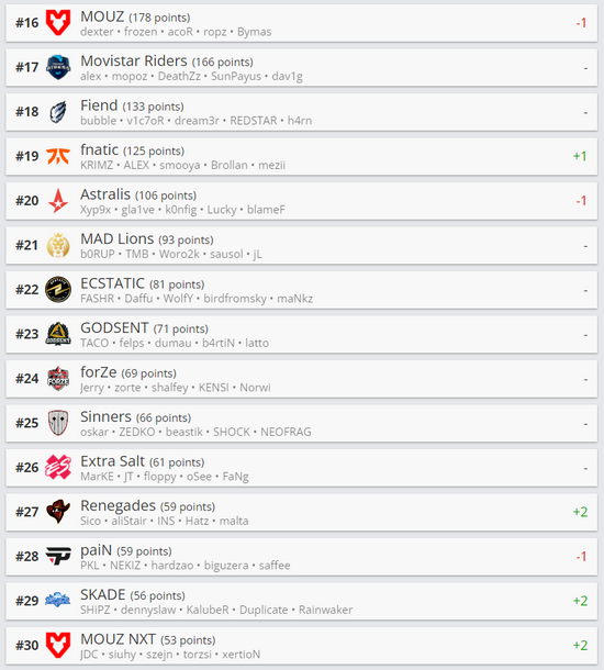 而在前三十中,老鼠青训队MOUZ NXT成功进入世界排名前30,与主队的身位只差14名。