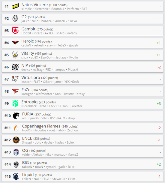 红星在战胜小火箭一举夺魁后,目前他们与第二名G2只差毫厘。Heroic与Vitality纷纷上扬一位,将NIP甩下。Entropiq虽未能在比赛中登顶,但优异的战绩还是成功使他们跻身前十。