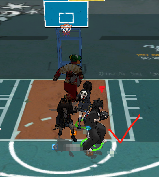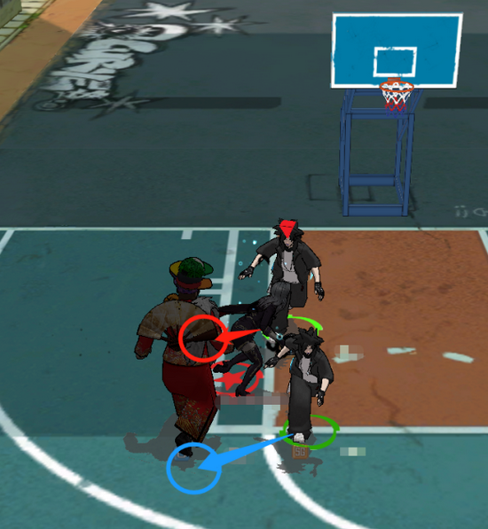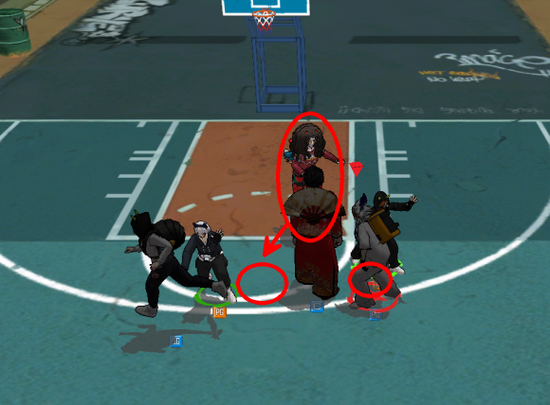 上图中,进攻方PG WA转到了队友C的前面,即将准备传球,并且有了高位位置。防守方PG在C的右侧,防守方C这是要卡一手对方PG的前D上篮位,等他有了传球动作之后,赶紧去防守红圈的位置,延误他往左边底线跑的路线,请注意,我这里说的是延误,而不是卡死,因为卡死的话,可能会吃进攻方C秒传给PG之后,直接一个空篮前D。防守方PG去卡蓝圈的位置,卡住对方C下方向键及捎带左方向键的位置,让他无法持球移动挡(如下图)