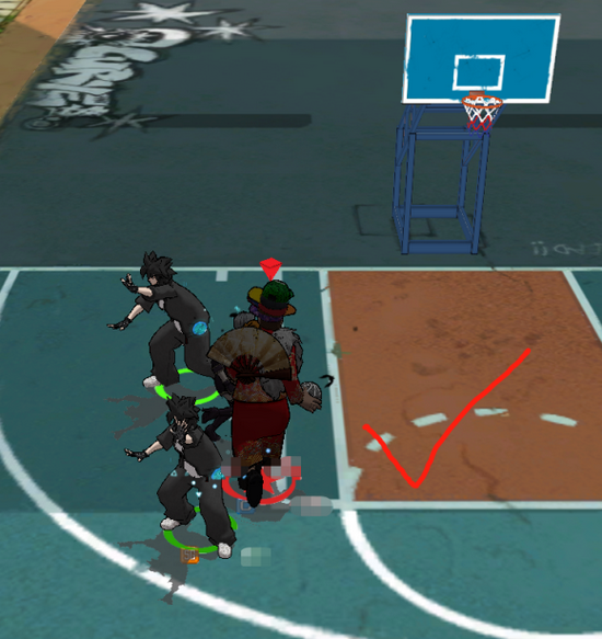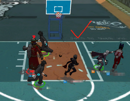 高位的防守首先要先懂我上面讲的高位位置的知识点,然后尽量卡主对方,延误对方有高位位置的时间,不能够让对方太轻易的有高位的位置。但是因为PG的WA以及C的大力是个无敌技能,强制位移技能,对方有高位位置也是不可避免的,那怎么样在对方有了高位位置之后去防守呢?(如下图)