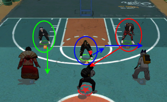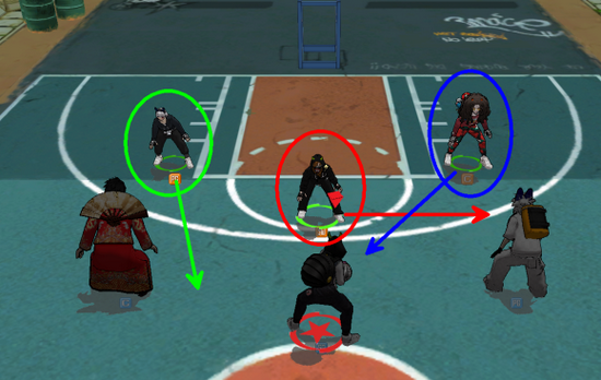 如上图,这是针对有一定的高位理解的同学们的防守方式。这个防守方式比较激进,需要队友有足够的1V1单防能力的防守站位。一样是蓝让红,不过这回的红是C,红优先过去,第一时间去卡到对方中间球员(也有可能中间进攻球员会是S职业,他会往右侧拉,没关系,这时候右侧的PG就会往左侧去跑找队友C,而这个时候他就会冲到C的脸上)