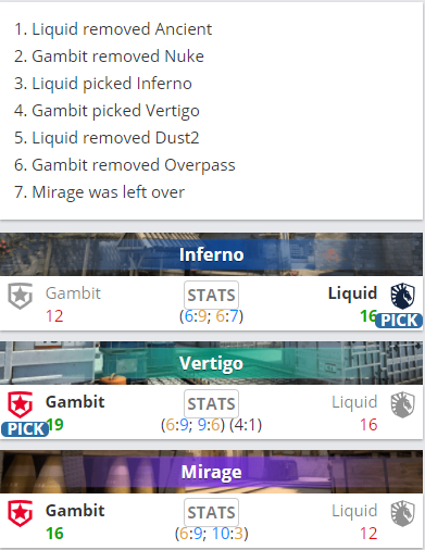 图二来到Gambit的选图Vertigo,Gambit赢下手枪局,在第六回合中,液体纯eco局翻盘,液体也渐渐的进入到自己比赛的节奏,而Gambit则靠着个人能力的发挥拿下几分,半场战罢,双方比分6-9。