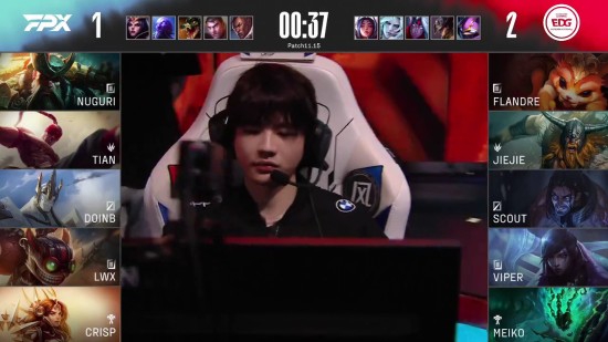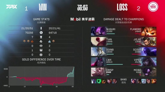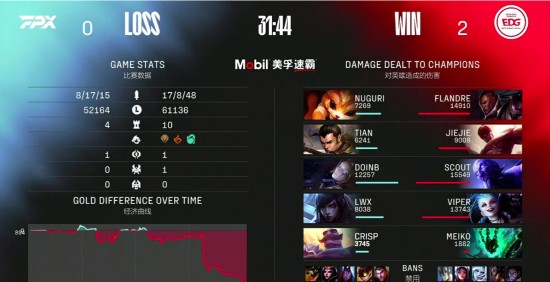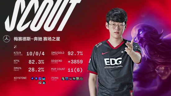 第二局赛后数据:MVP:团战处理完美斩获四杀的EDG.SCOUT(瑞兹)
