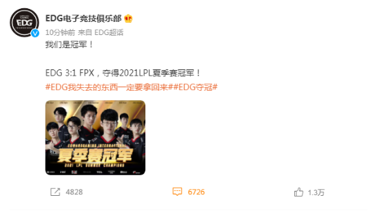 EDG Scout夺得总决赛FMVP此外,EDG官博在庆祝了本届赛事夺冠之外,还在微博中加入了“EDG:我失去的东西一定要拿回来”的TAG,也是实现了EDG之前入围总决赛时的豪言壮志!
