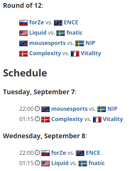 各自小组第一的队伍:Heroic、OG、NaVi和Gambit将直接进入四分之一决赛,在那里他们将等待四场淘汰赛第一轮胜出的队伍。