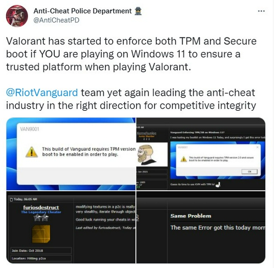 Valorant已经开始强制执行此要求,如果你在Win11上玩,请确保你的电脑启用了TPM 2.0和Secure boot。该要求也可能不仅限于《Valorant》,毕竟PC是作弊行为最泛滥的游戏平台。