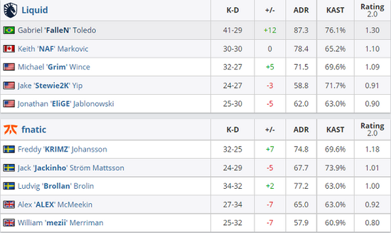 首张图来到fnatic的选图Nuke,液体一开场就很快进入到比赛的状态,赢下手枪局后顺势而下连拿五分,液体的状态是越打越好,fnatic的几波爆弹战术也是被液体轻松化解,上半场fnatic仅靠个人能力的发挥拿到三分,半场战罢双方比分12-3。下半场手枪局FalleN在只剩几滴血的情况下赢下残局,丢掉手枪局后fnatic大势已去,液体很快便以16-4结束图一。