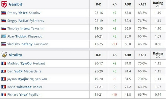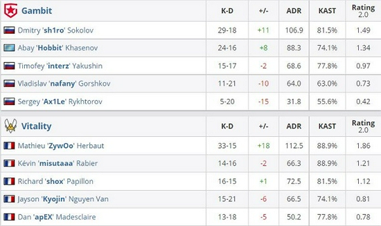 下半场ZywOo与misutaaa二人合砍四杀拿下手枪局,但随后vitality就惨遭红星刚枪翻盘,不过在长枪局的对决中,vitality多人爆发以强劲的个人能力挽回局势并率先拿到赛点,危急时刻sh1ro再次站出来一把法玛斯打赢1v2残局,但掉枪严重的Gambit在第三十回合只能选择混起,他们的非常规前压也被小蜜蜂轻松化解,最终占据人数优势与枪械优势的vitality以16-14战胜Gambit。