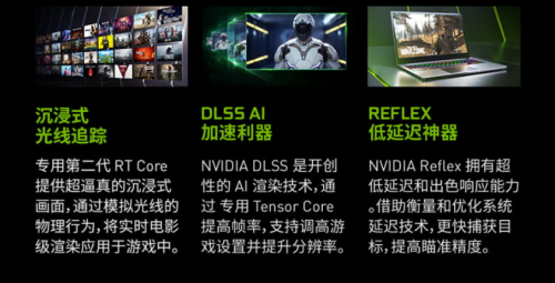 GeForce RTX 30 系列笔记本电脑在专用的第二代RT Core加持下,可实现快速光线追踪,提供更逼真的游戏画面,提升游戏沉浸感;专用的Tensor Core则为NVIDIA DLSS这项开创性的AI渲染技术提供动力,NVIDIA DLSS能提高帧率,为游戏生成精美、清晰的图像的同时还为玩家提供了性能空间,使质量设置最大化并提高输出分辨率。NVIDIA DLSS 广泛用于近 60 款游戏,包括当下最热门的顶级游戏,比如《永劫无间》、《荒野大镖客:救赎2》和《赛博朋克2077》等。