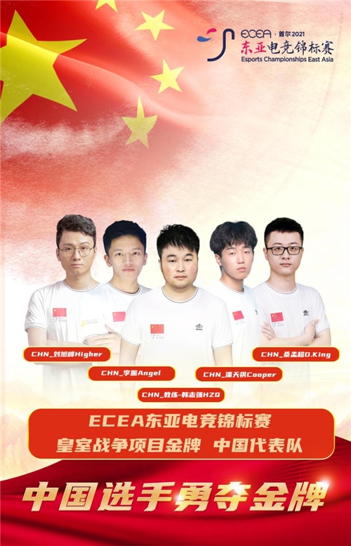 2021年9月12日,由韩国文化体育观光部主办,中国文化娱乐行业协会(CCEA)、韩国电子竞技协会(KESPA)、日本电子竞技联合会(JESU)联合承办的首届东亚电竞锦标赛完美收官,中国代表队最终获得团体总冠军。