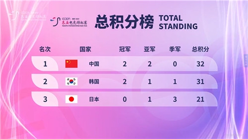 最终,中国代表队以两个正式项目冠军、一个表演项目冠军、总积分32的成绩成为了本届东亚电竞锦标赛的团体胜利国。