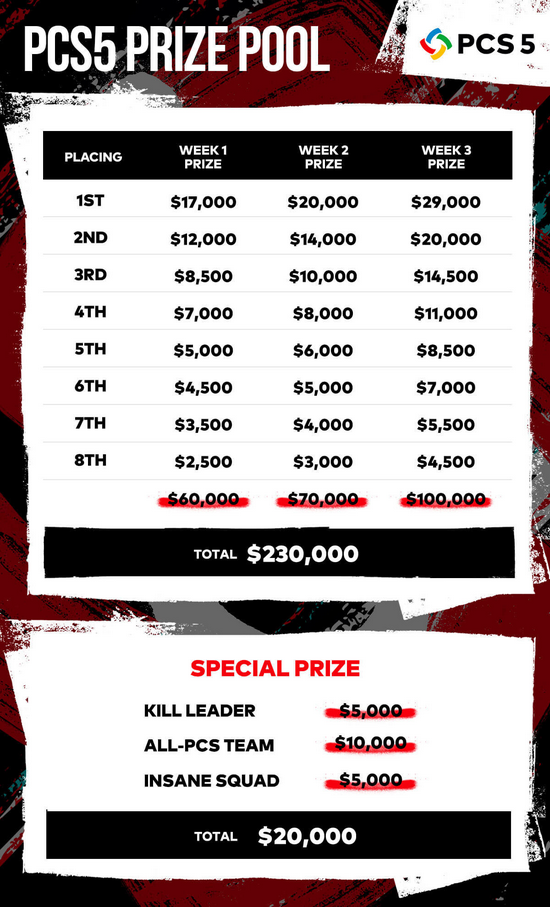 PCS5洲际赛基础总奖金为100万美元,各赛区均为25万美元。同一赛区内,三周比赛的奖金分别为6万、7万和10万美元,每周排名前8的战队将瓜分当周奖金。三周比赛结束后,根据所获总奖金之和对各队进行排名,总奖金最高者将获得PCS5洲际赛的总冠军!此外,除了基础排名奖金,赛事将设2万美元特别奖池,分别给予洲际赛“淘汰王”“最佳阵容”以及“最强小队”。